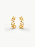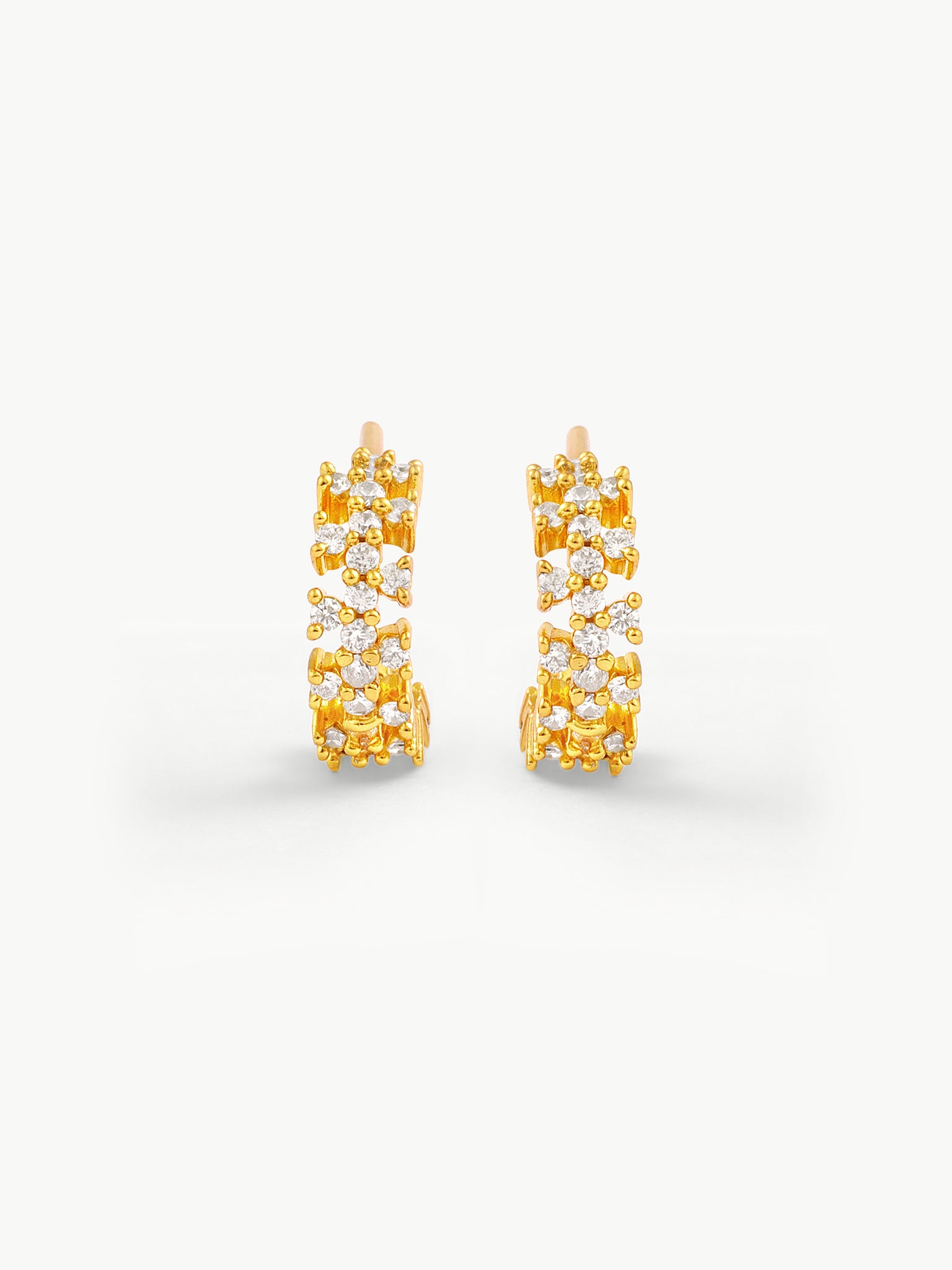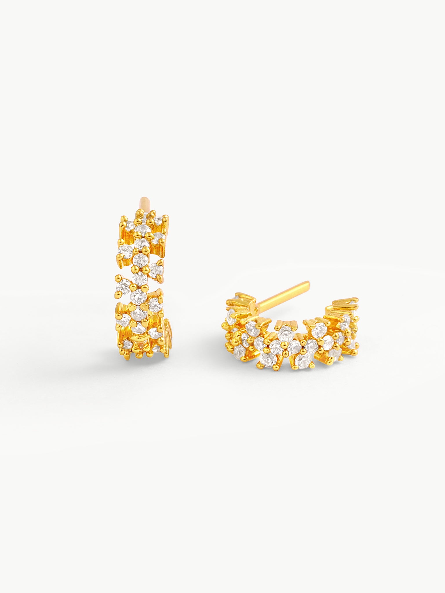Handcrafted in 925 Sterling Silver, finished with a luxe 18K gold polish, and set with brilliant white AAAA zirconia stones, these huggies capture the light beautifully with every move. ✨