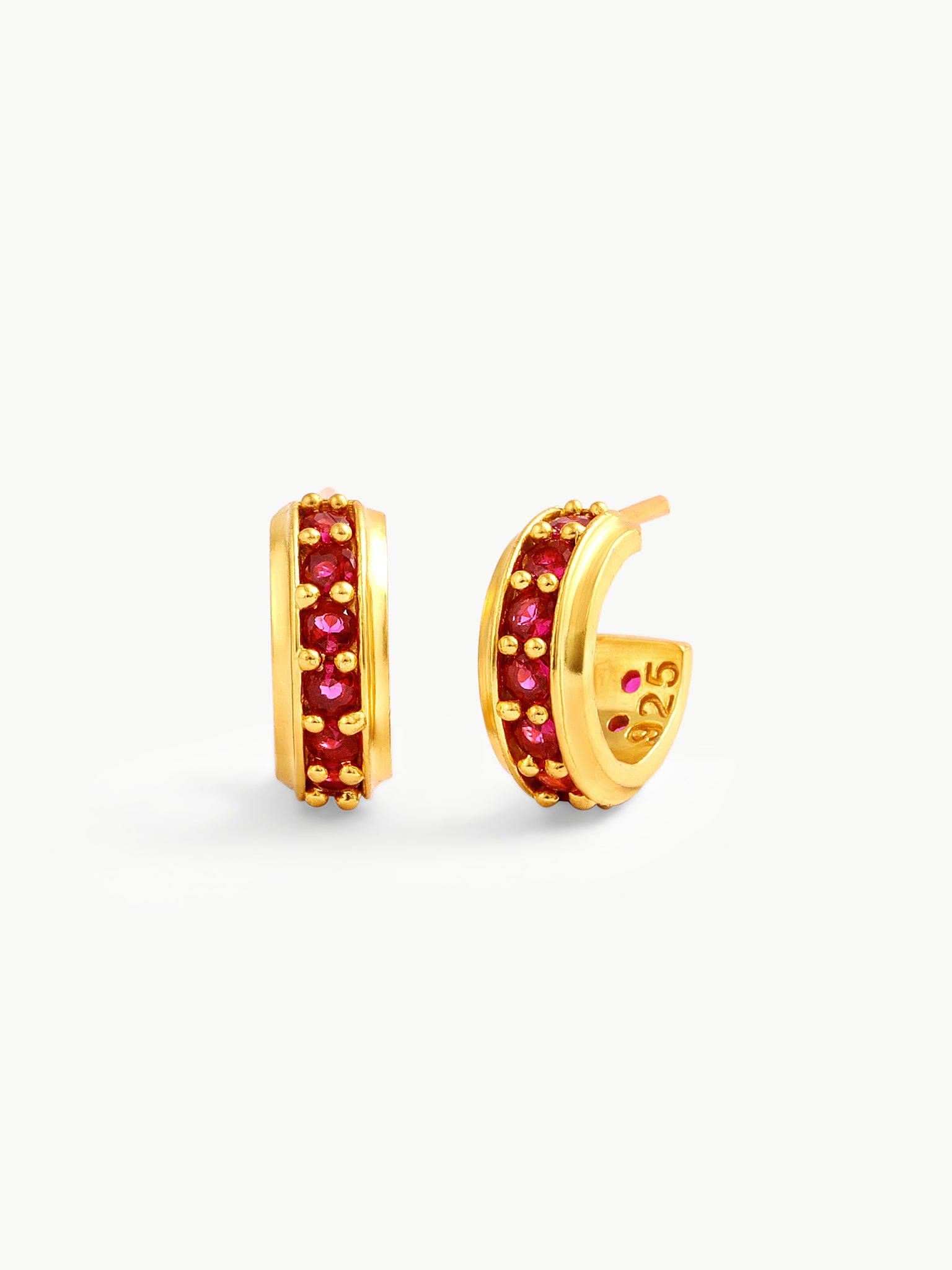 Handcrafted in 925 Sterling Silver, finished with a luxurious 18K gold polish, and set with vivid red AAAA zirconia stones, these hoops bring effortless glamour to any outfit, from brunch to a night out. ❤️