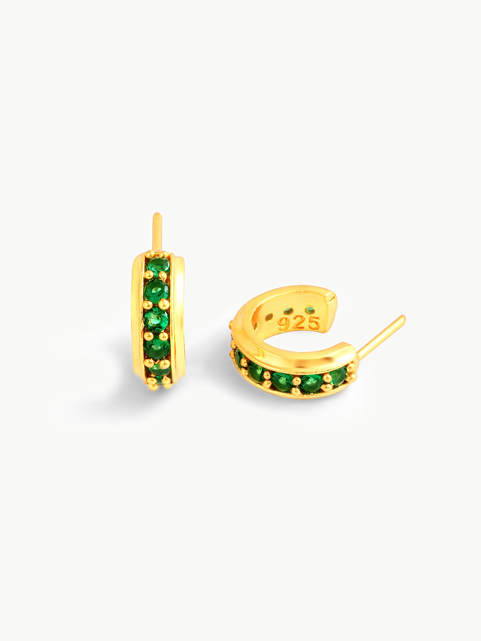 Handcrafted in 925 Sterling Silver, finished with a luxurious 18K gold polish, and adorned with vivid green AAAA zirconia stones, these hoops blend modern elegance with effortless wearability. 💚